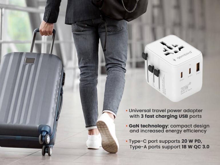 ALIMENTATOR retea 220V GEMBIRD, universal, conectori: US/UK/EU/AU, 2x USB Type-C PD 20W, 1x USB-A QC 18W, siguranta 10A, max. 2500W, alb, „TPA-1A2C20-01-W” (timbru verde 0.18 lei)