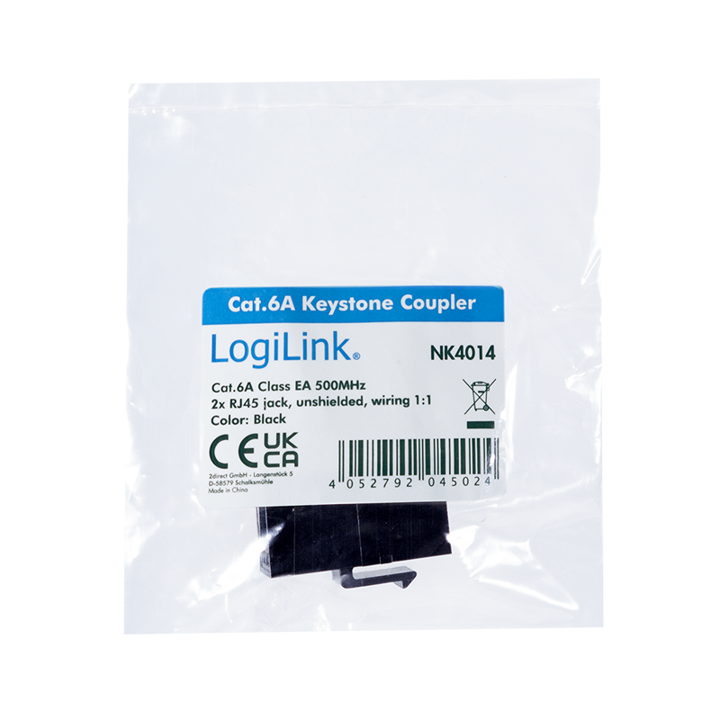 CUPLA RJ-45 LOGILINK pt. cablu UTP, Cat6a, 2 x RJ-45 (T), neecranat, montare prin clipsare, keystone, latime 14.7mm, „NK4014”