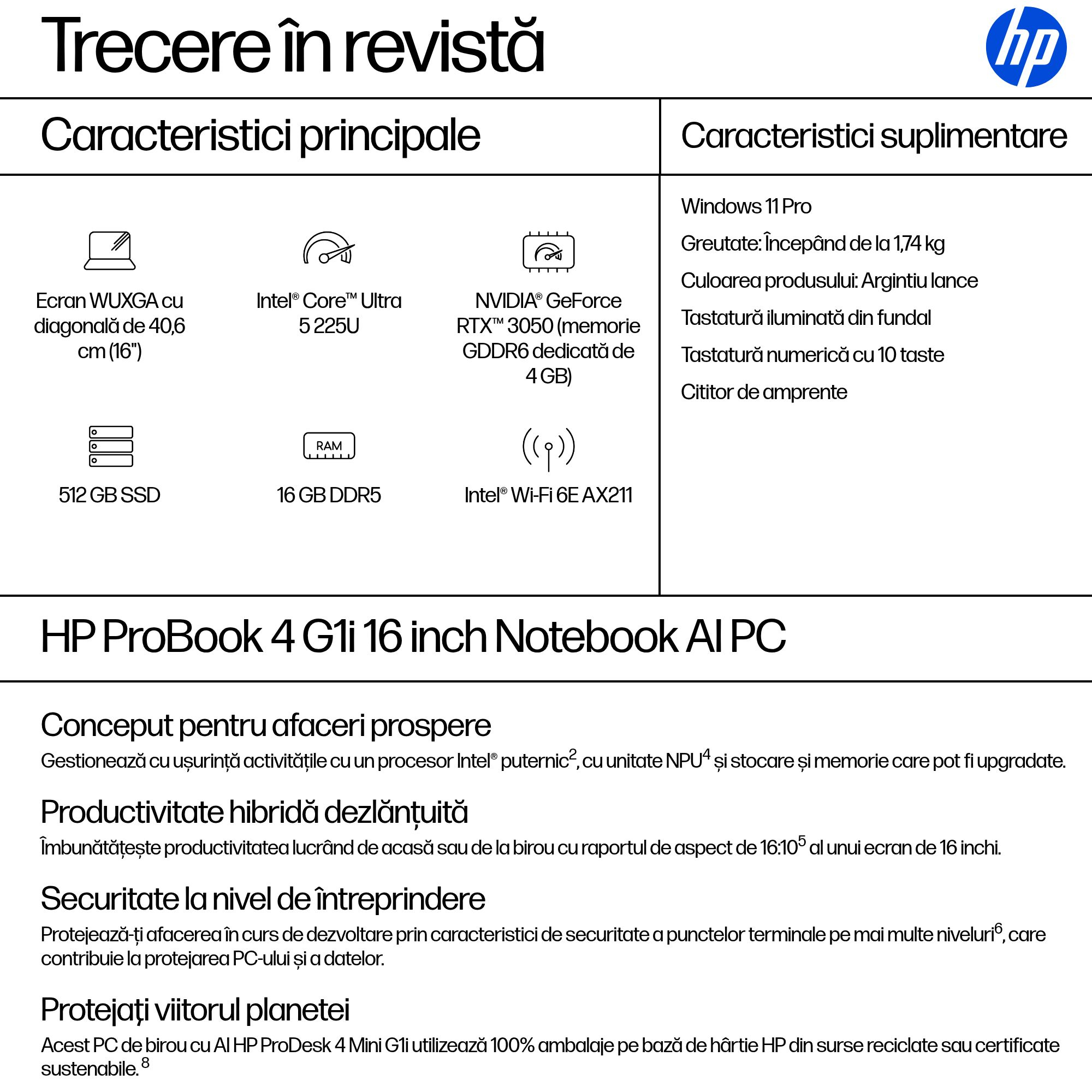 NB PB 4 G1I AI CU5-225H 16″/16/512GB W11P AD2L3ET HP „AD2L3ET” (timbru verde 3.5 lei)